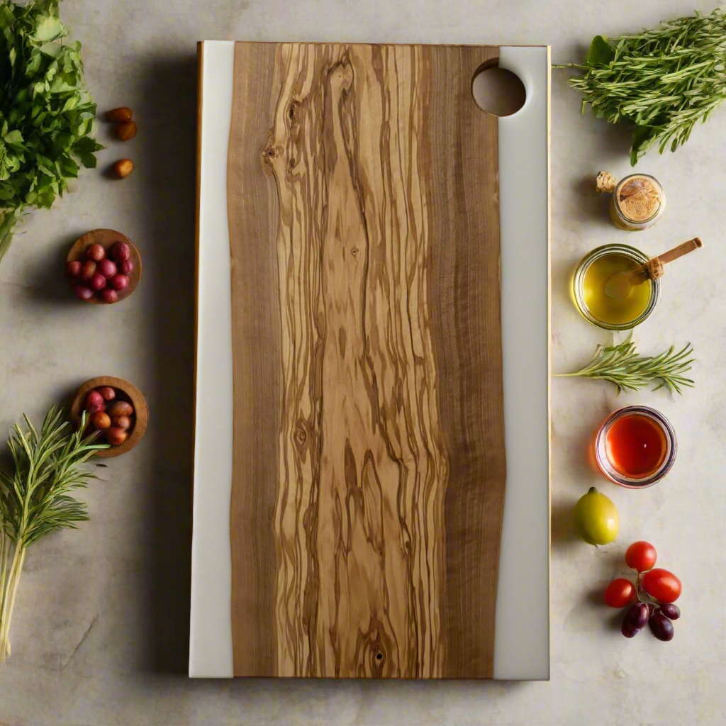 This highly figured live edge rustic Olive wood and white resin cast charcuterie board is a true and unique conversation piece that is sure to be the talk of the party! Great for gifting!